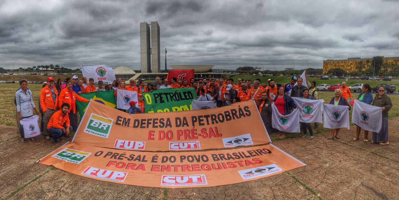 Petroleiros da FUP, FNP e Aepet realizaram nesta terça-feira, 14, em Brasília um ato político em defesa da Petrobrás e do Pré-Sal, com participação de trabalhadores da educação (CNTE) e do campo (MAB, MPA, MCP), de estudantes (UNE e UJS) e de outros movimentos sociais. A manifestação foi chamada pela Frente Parlamentar em Defesa da Petrobrás, tendo como foco o enfrentamento ao Projeto de Lei 4567/16, que visa tirar da Petrobrás a função de operadora única do Pré-Sal, bem como acabar com a participação mínima de 30% que a empresa tem garantida nos processos licitatórios para exploração dessas reservas.